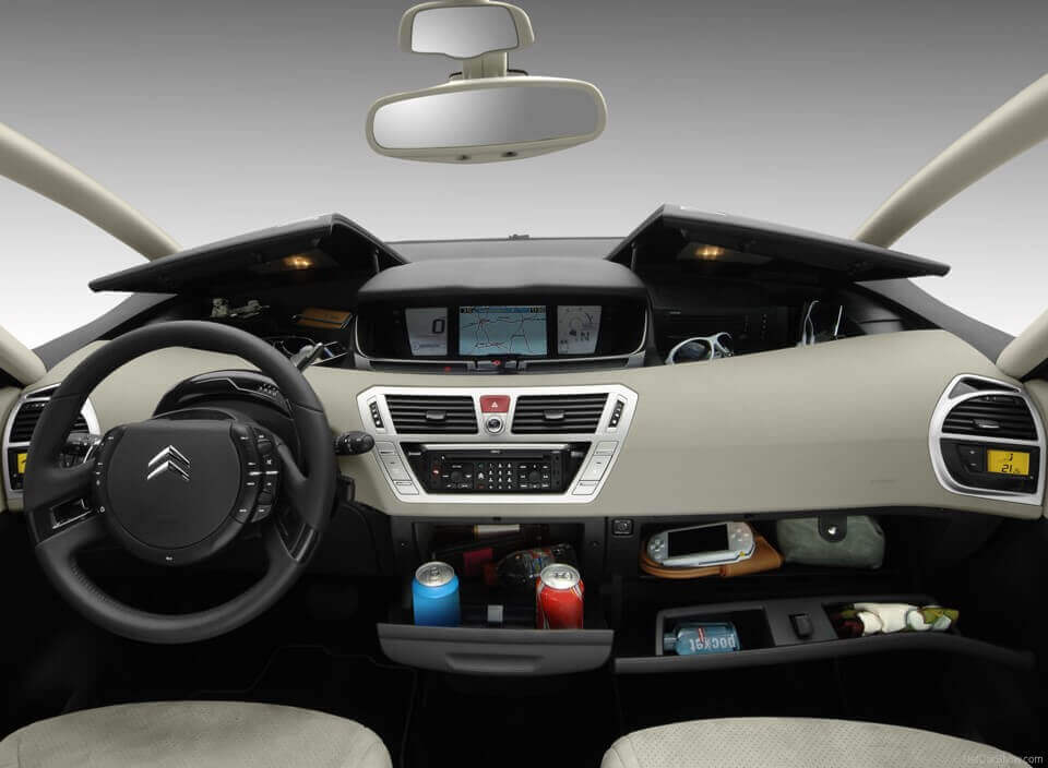 Une planche de bord moderne (qui reprend entre autres le système de commandes de clim déportées inaugurées par l’Espace 3) et très logeable. Avec l’aide de scratch, je transformais le miroir de surveillance enfants en support pour fixer le Coyote… (source : citroen.com)